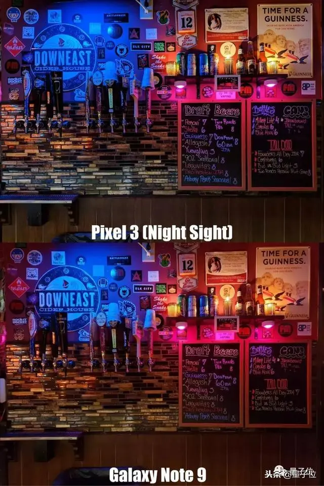 不过,放大看细节,你就会发现Pixel 3拍摄的细节更清晰,酒吧右上角墙上的那个孕妇不要独自喝酒的告示牌上有几行小字,Pixel 3拍摄的照片上,这几行小字清清楚楚,但Note 9嘛,就模糊了很多。