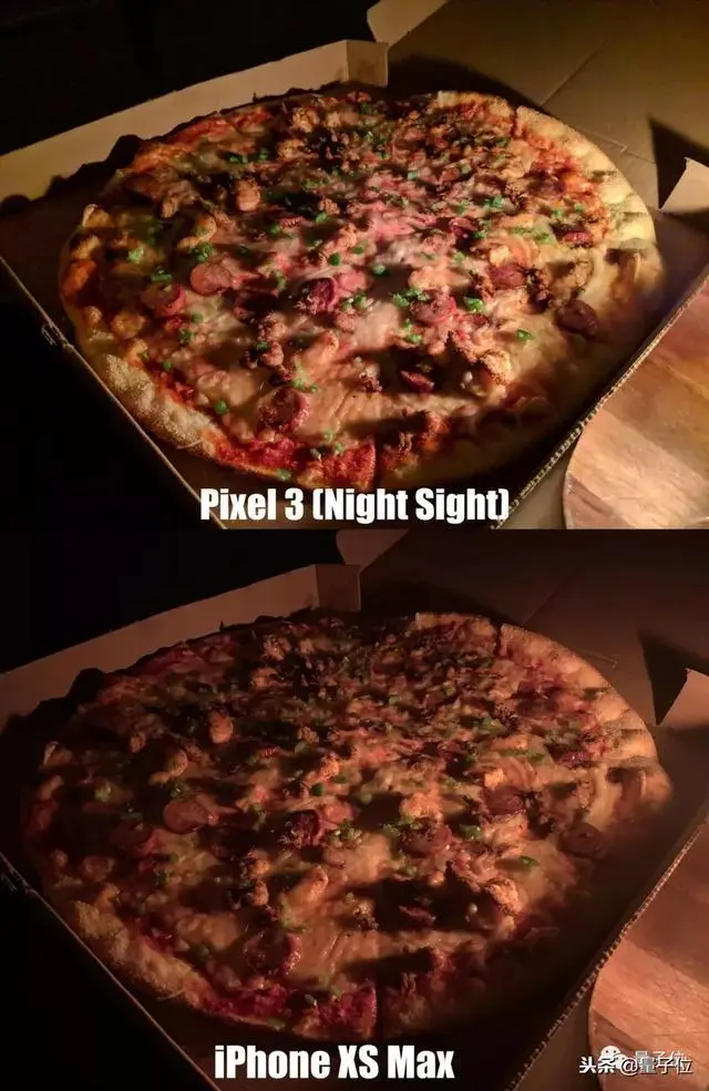 额……明暗度完全不一样,Pixel 3拍出来色泽鲜亮,披萨上的肉粒清晰,令人食欲大开。
