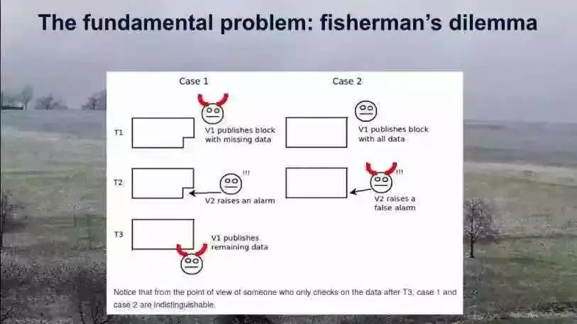 实际上,其中一个我们无法完全把握、但在逐步接近的根本问题,就是所谓的”渔夫两难“(Fisherman’s Dilemma)。这是分片研究中的一个非常根本的概念,描述了状态的扩展性执行(scaling execution)、程序的扩展性执行与数据扩展可得性(scaling availability)之间的巨大区别。基本问题是这样的:如果要运行程序,你可以让人们承诺答案是什么,然后你可以用挑战游戏、用二分法搜索确定在哪一步上谁算错了(译者注:即每次都只运行一半的运算步骤,比对结果,来发现双方到底在那一步上算错了),确认事实后就可以惩罚那些给出错误答案的人。而数据可用性的问题是:无论挑战游戏如何运行,你都可以作弊,因为你可以完全不公开任何数据,直到机制来检查你有没有公开数据,然后你只要公开机制要检查的那部分数据就可以了。