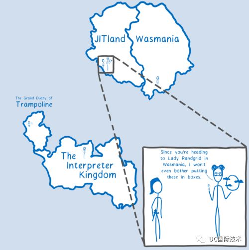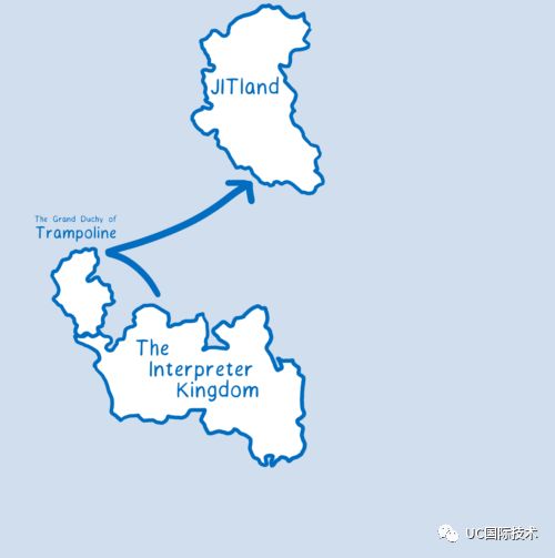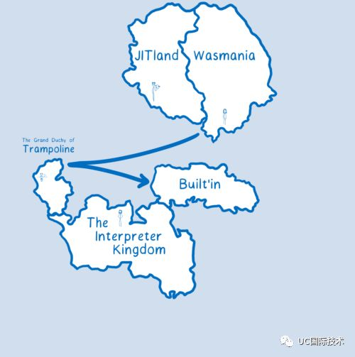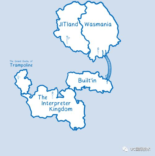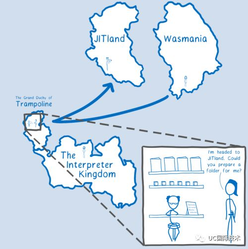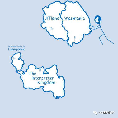 我们通过将经 JIT 编译的 JavaScript 和 WebAssembly 代码都归纳到相同的文件夹来解决这个问题。 这有点像我们将两个大陆推到一起,这使得你根本不需要离开这个大陆。