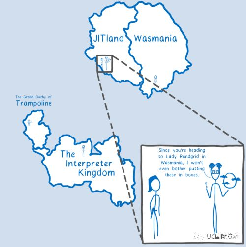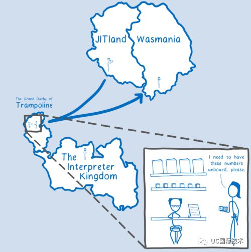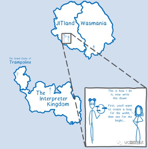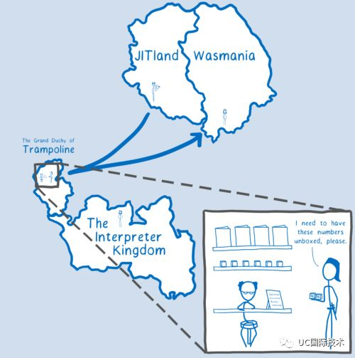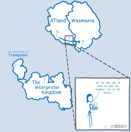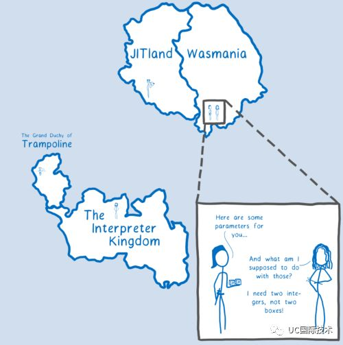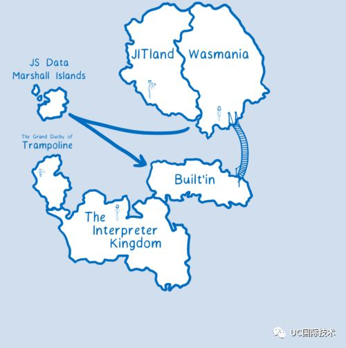 当我们首次添加 WebAssembly 时,我们为它提供了一个不同类型的文件夹。 因此,即使 JIT 编译好的 JavaScript 代码和 WebAssembly 代码都被编译成了机器语言,我们仍将它们视为使用不同的语言。 我们把它们看作是在不同的大陆上。