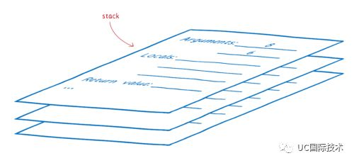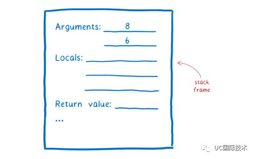 它使用称为堆栈帧(或调用帧)的东西来完成此操作。堆栈本质上就像一张纸,它记录了传入函数的参数、返回值应该返回的位置、并且还跟踪函数创建的所有局部变量。
