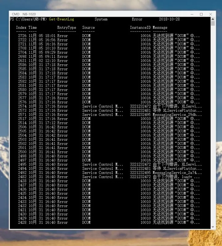 只不过这样执行下去实在是窗口滚动完全停不下来,那么就加入约束条件,例如是2018年10月27日的日志,只显示错误,那么就使用这条命令 Get-EventLog -LogName System -EntryType Error -After 2018-10-28 。