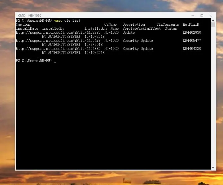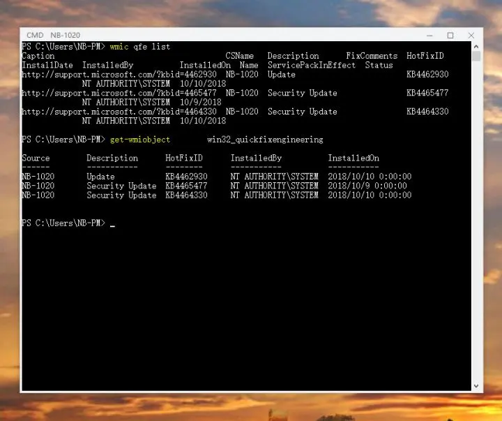 其实在很多企业没那么麻烦,如果你是一个专业运维,公司电脑网络中建立域网络几乎可以无需登录客户机就可以实现,当然对于一个小微企业而言,直接使用远程终端管理可以在一定程度上做到类似域网络的效果,例如我现在查看这台客户机的软件更新情况,使用远程 cmd / powershell 可以轻松做到,只需要输入 wmic qfe list 。