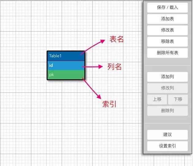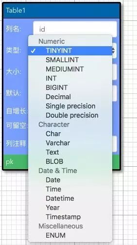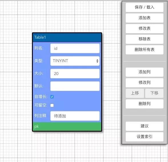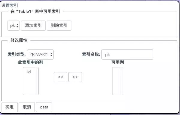 新建一个表,默认会有一个id列和索引名为pk的主键,如下图