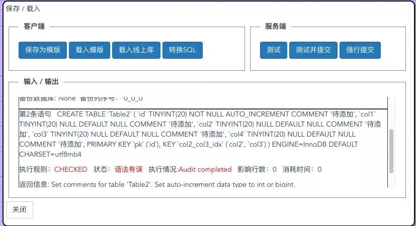服务端部分的测试、测试提交与强行提交是检测sql中是否存在不符合要求的问题。例如