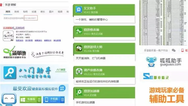 通过搜索“手游 破解”的关键词,相关结果高达1250万条;各种游戏修改器、玩家辅助工具、模拟器也是层出不穷;无限金币、无限钻石、自住跑、自动瞄准、自动任务等破解APK更是广受玩家追捧......可以发现,手游的安全问题相当严重。