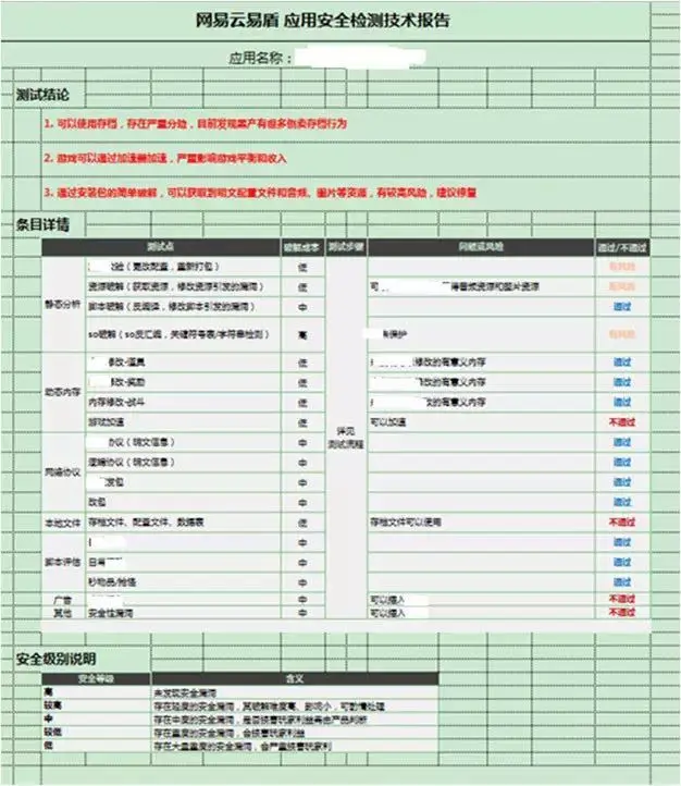 首先是渗透测试。以手游APP渗透测试为例,易盾会从静态和动态,以及网络协议、本地文件、脚本安全性评估、广告安全性评估、其他安全漏洞等各个维度对游戏进行安全风险分析,并给出每项的测试结果。如下图所示,即为某个游戏的安全检测结果样例。