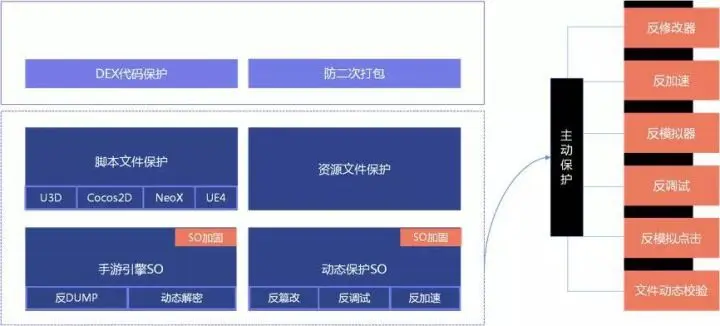 整套手游保护的核心就是虚线框里的功能。除了静态保护,易盾还提供了动态主动保护,比如反修改、反加速、反模拟器、反调试、反模拟点击、文件动态校验等功能都是手游急需的功能,通过静态和动态多维度的保护,手游的安全等级得到了极大的提高。