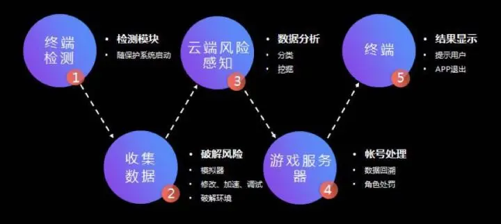 易盾反外挂系统能够提供指定帐号ID的多维度查询系统,帮助运维人员快速发现指定角色的外挂行为。反外挂工作通过终端检测、收集数据、云端风险感知、游戏服务器、终端这一完整流程,联动终端、云端和游戏服务端三端,有效解决了游戏的安全问题。