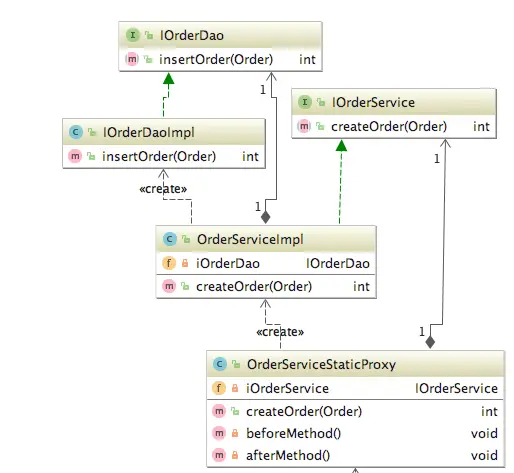 下面的uml类图中,代理类OrderServiceStaticService中包含被代理对象OrderService,在代理类中对被代理对象的被代理方法进行增强,客户端直接调用代理类的createOrder方法(被代理的方法)即可。
