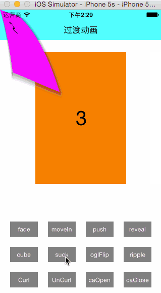 私有API提供了其他很多非常炫的过渡动画,比如@”cube”、@”suckEffect”、@”oglFlip”、 @”rippleEffect”、@”pageCurl”、@”pageUnCurl”、@”cameraIrisHollowOpen”、@”cameraIrisHollowClose”等。