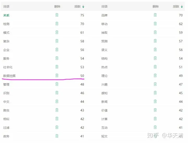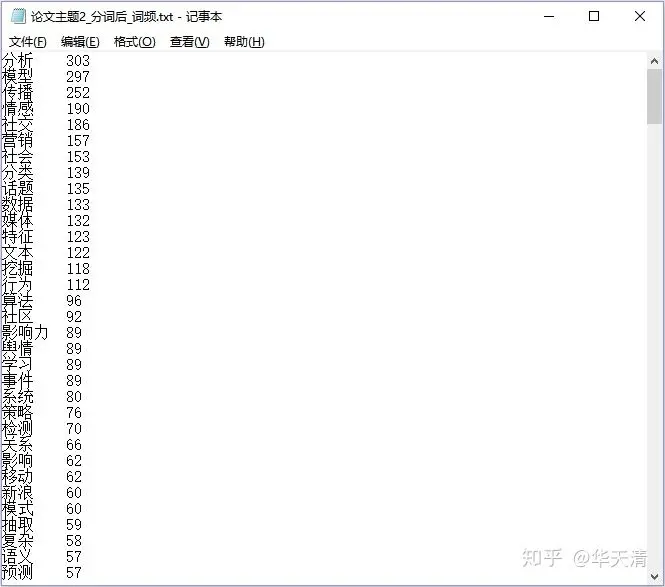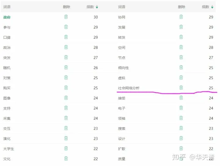 - 选词结果表:跟切词表一样的结构,但是只有筛选过的词,如上图,很多高词频的词是无助于分析的,甚至会干扰分析结果