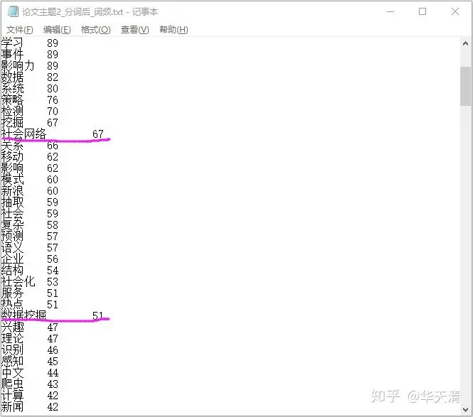 然后重复刚刚的“分词 > 词频统计"步骤,可以看到最后词频统计结果中出现了刚刚添加的这三个词语,说明ROST识别到了词库的更新。