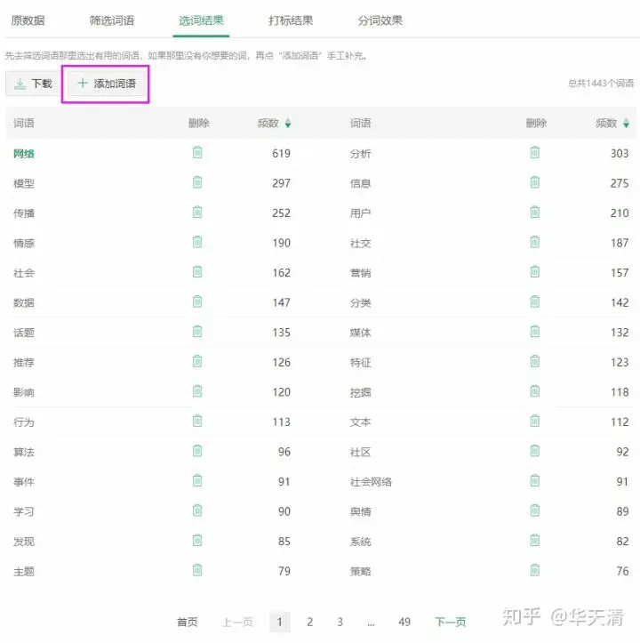 导入之后产生一个分词任务,可以在“我的任务”中看到。如果进入“筛选词语”页面,就可以看到分词产生的词语已经按照词频高低进行了排序。