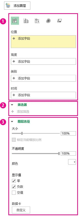 选择绘制的地图图表类型,可以是堆积柱状图、簇状柱形图、气泡图、热度图或者是区域图。选择不同的图表类型之后,字段的选项会稍微有些不同,相同的是位置信息都是必须添加的