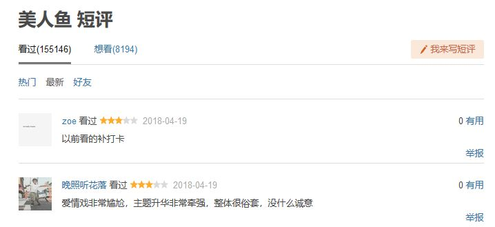 至于怎么才能了解到消费者的偏好,这个就很简单了,你可以在网络上找到很多关于电影的评论、排行、评分等等,比如,优酷、爱奇艺等视频网站上的评论留言,特别是有了弹幕后,大家在网上留言得更加热烈了,但是,在国内要评价一部电影的质量,大家都会去看豆瓣评分,说明豆瓣是最有参考价值的平台之一,所以下面会用豆瓣电影《美人鱼》的短评,来分析一下评价倾向、话题焦点。