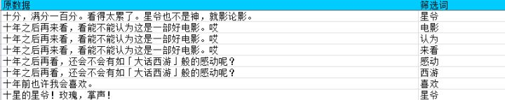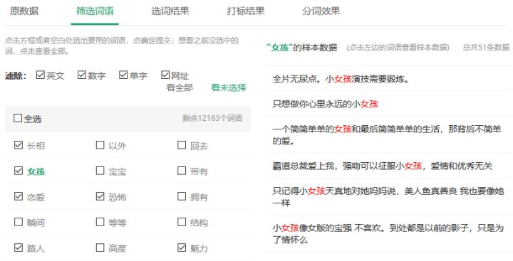 根据星级打分可以把豆瓣影评自动分成好中差3类,所以就没做情感分析,如果你要做情感分析,也可以利用上面的筛选词语功能,把具有情感倾向的词语筛选出来,然后在打标结果表里可以看到每条原数据所包含的打标词,再整理一下哪些词语组合在一起所表达的情感倾向,就可以判断出原数据的情感倾向;