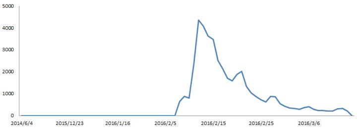 按照评论日期统计了每天的评论量,如上图,发现在电影上映时间2016-02-08之前也有零星的评论,才想起来美人鱼好像调过上映档期,这个不多说了,在上映一周内,评论量呈现快速上升趋势,在2月14日情人节达到顶峰,那天刚好是周日,估计很多情侣去看这部电影了,之后就是回落趋势,在2月21日有一个小高峰,也是周日,说明节假日会促进消费。