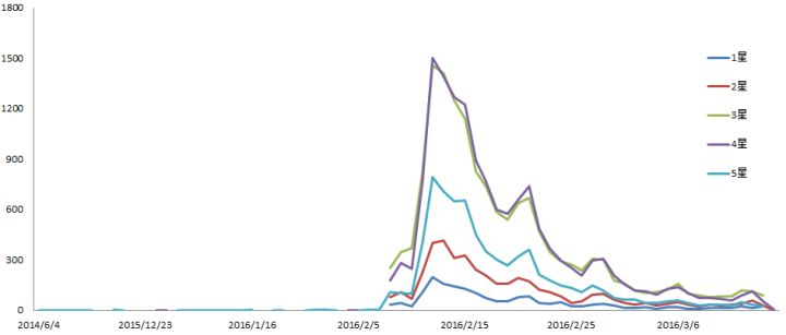 按时间统计各个星级的打分数量,如上图,可以看出从《美人鱼》上映以来,3星、4星一直是大众的主流评分, 但是上映之前有几条评论是5星的,说明大家对电影一开始期望比较高,但看完电影后应该是有点失望,所以才会导致评分低于预期。