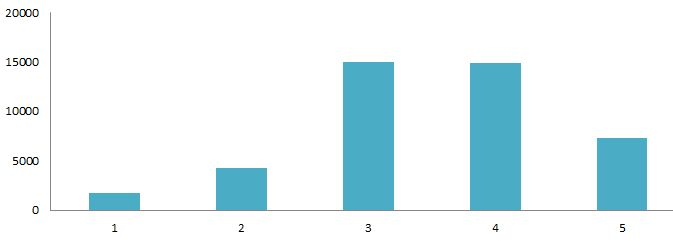 统计电影《美人鱼》各个星级的数量,从上图看出,以3星、4星评分最多,其次是5星,说明大家对电影的总体评价是中等偏好的。