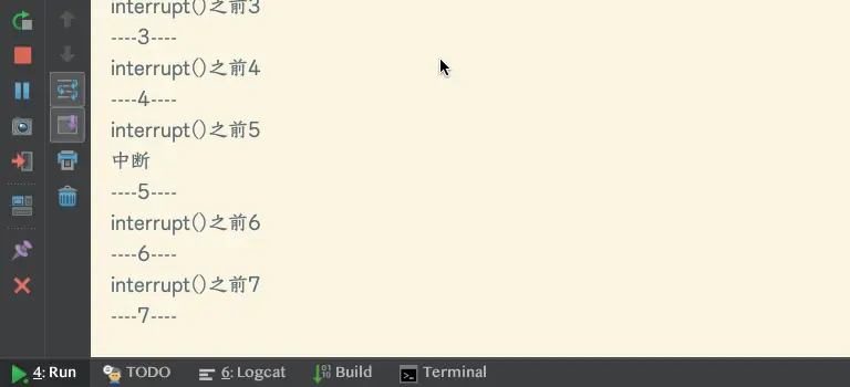 - interrupt()-虽然方法注释上写着中断线程,但是它只是表示一个中断位置标识符。简单示例: