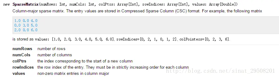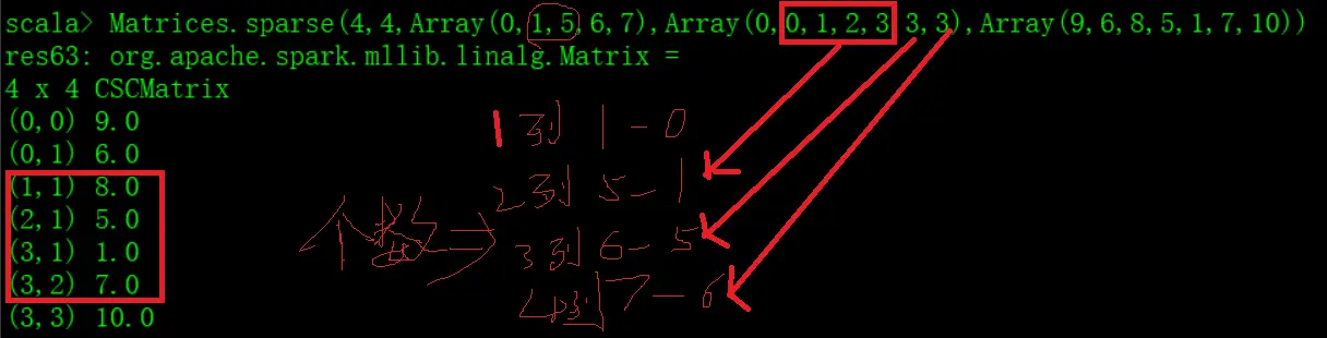 val sm: Matrix =Matrices.sparse(4,4,Array(0,1,5,6,7),Array(0,0,1,2,3,3,3),Array(9,6,8,5,1,7,10))