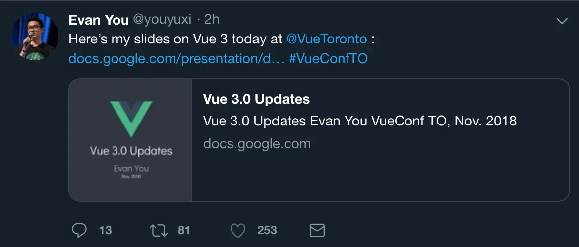 Evan You 刚刚发布了最新的 Vue 3 和他在 Vue Toronto 的演讲内容: