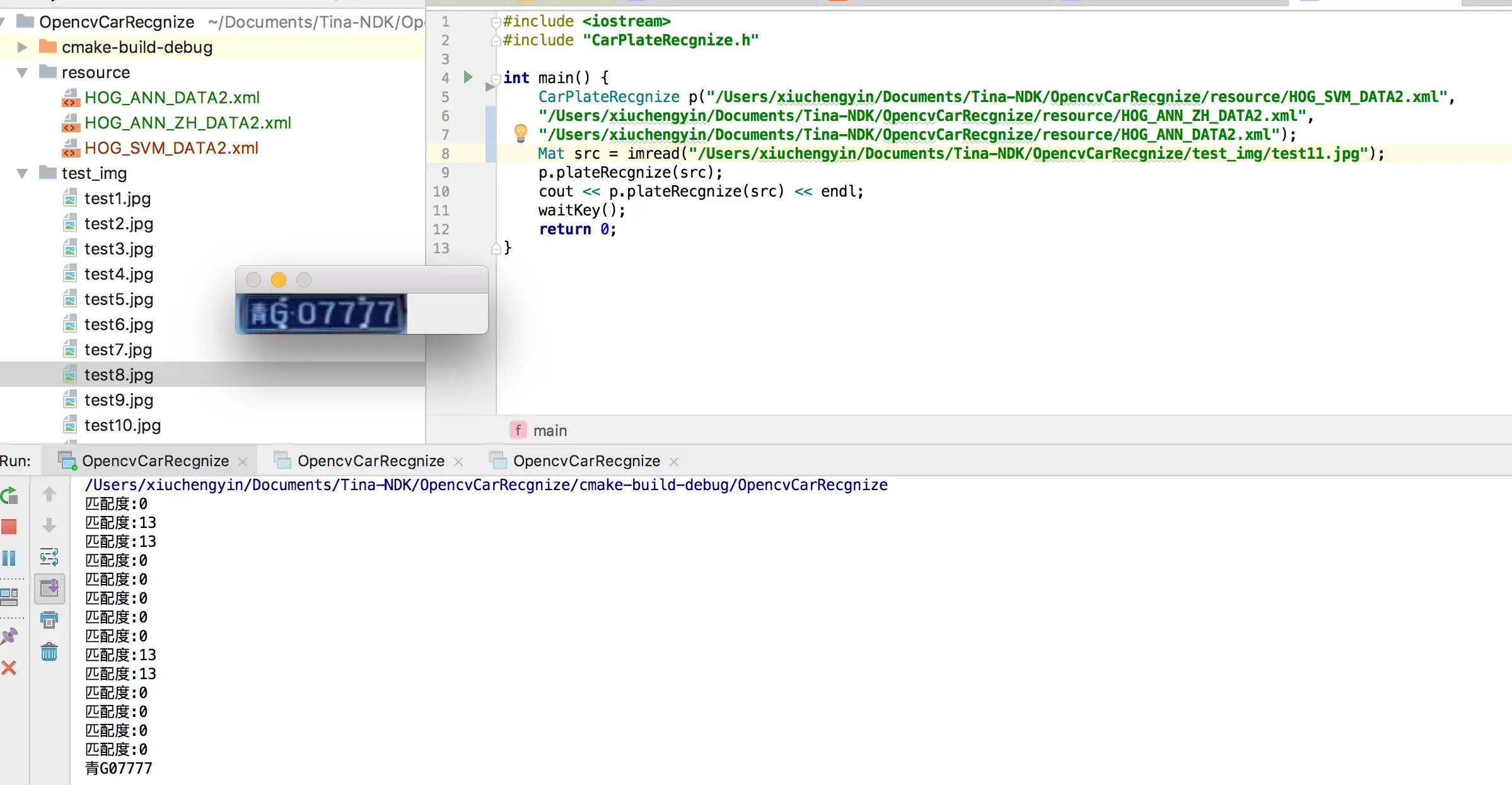 因为样本模型不是很全,中文字识别率比较低,以下是识别出来的车牌号。
