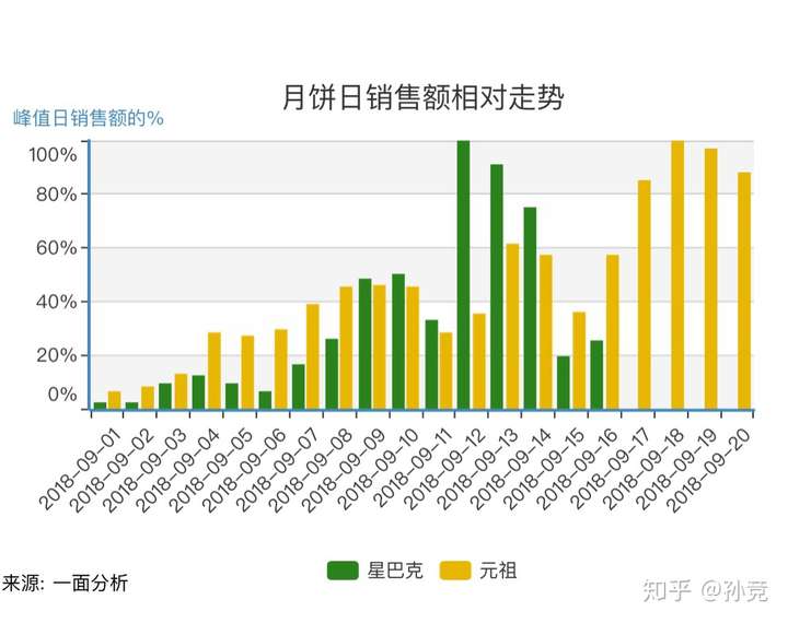 因为比的是走势,咱先不管他们的绝对销售额,两位都以自己的峰值日销售额为100%。星巴克发生在9月12日,元祖发生在9月18日。两者都是旗舰店的数据,因为旗舰店在天猫销售额占比星巴克是97%,元祖是100%。