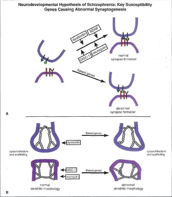 关于精神分裂症的发病机制,有很多的假说,多巴胺递质水平假说与N-甲基-D-天门冬胺酸受体功能假说促成了早期抗精神病药物的开发,但是递质层面的假说不能直接解释精神分裂症的病因,科学家们一直在寻找更为基础的假说,其中最为主要的是遗传和发育假说与神经退行性疾病假说[2]。