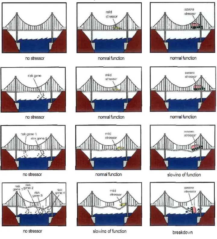 一些早期的蛋白质聚集可能在青春期前就导致了突触模式的异常,在后续的过程中,遗传因素继续导致突触维持障碍,多个遗传因素的叠加与环境因素共同加速了突触的瓦解与神经元凋亡。