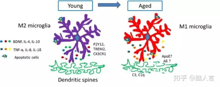 M1是神经损伤型,会释放一些神经毒素和炎症因子,例如IL-6, IL-1ß, TNF-α等,损伤神经元,诱导神经元的死亡;M2是神经保护型,释放一些神经营养因子,促进神经元的生长,例如BDNF, IL-4, IL-10等,保护神经元。在急性损伤期,小胶质细胞的激活主要是M2型,对神经元的存活是有利的,而在慢性损伤中,小胶质细胞的激活主要是M1型,会促进神经元变性死亡。在AD患者中,过度激活小胶质细胞以类似正常修剪神经突触的方式对突触过度吞噬和清除,从而造成AD患者突触丧失及认知能力下降。由此可见,小胶质细胞在AD的病理变化是一把“双刃剑”。因此,我们需要利用其有利的一面,抑制其有害的一面,以达到治疗AD的效果。