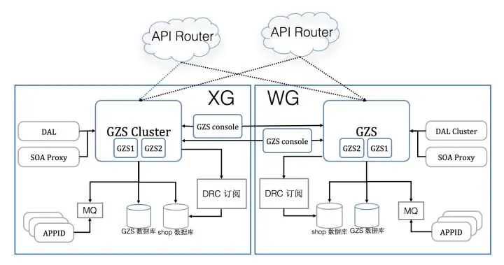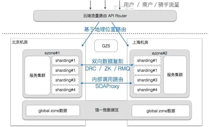 - 可用性优先:当发生故障切换机房时,优先保证系统可用,首先让用户可以下单吃饭,容忍有限时间段内的数据不一致,再事后修复。每个 ezone 都会有全量的业务数据,当一个 ezone 失效后,其他的 ezone 可以接管用户。用户在一个ezone的下单数据,会实时的复制到其他ezone。