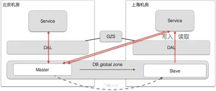 这是一种跨机房的读写分离机制。查询走本机房的数据库salve,写全部走一个Master,对业务方来说DB的配置透明的。