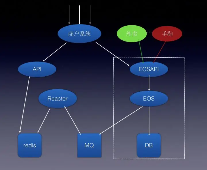 商户读请求调用API, 写请求调用EOSAPI,其中EOSAPI是订单基础服务,压测流量从商户系统进来继而评估容量,这样压测得到的数据比实际线上真实情况会偏优,因为线上EOSAPI不仅只有商户系统在调用,下单服务也会同时调用。
