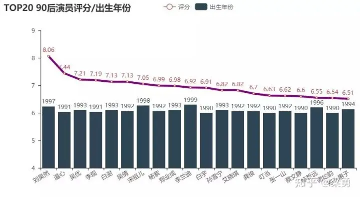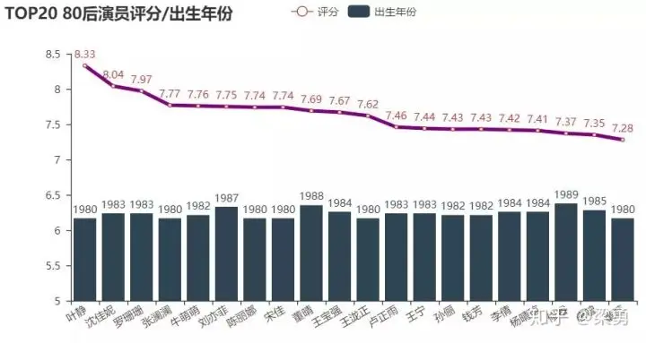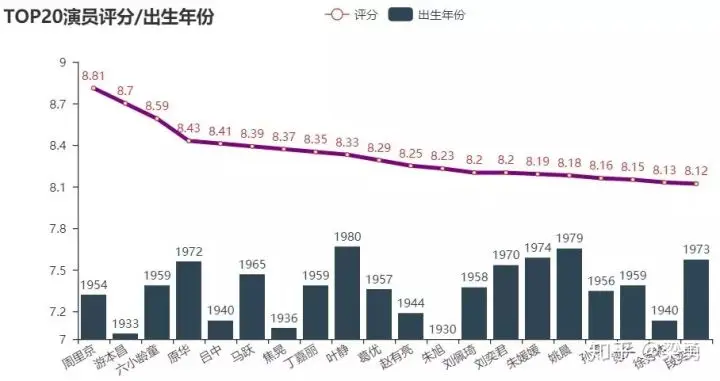 我们此次根据演员参演的剧集评分,考虑演员在其中角色的重要性进行赋权,结合剧集评论数量,加权平均得到每个演员的评分情况。首先是我们评选的评分靠前的演员及其出生年份: