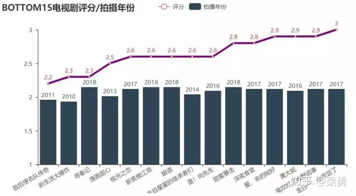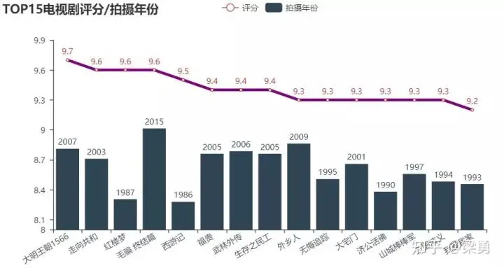 我们在剧集对比部分主要展示两部分数据,首先是TOP15以及BOTTOM15的剧集评分及拍摄年代:
