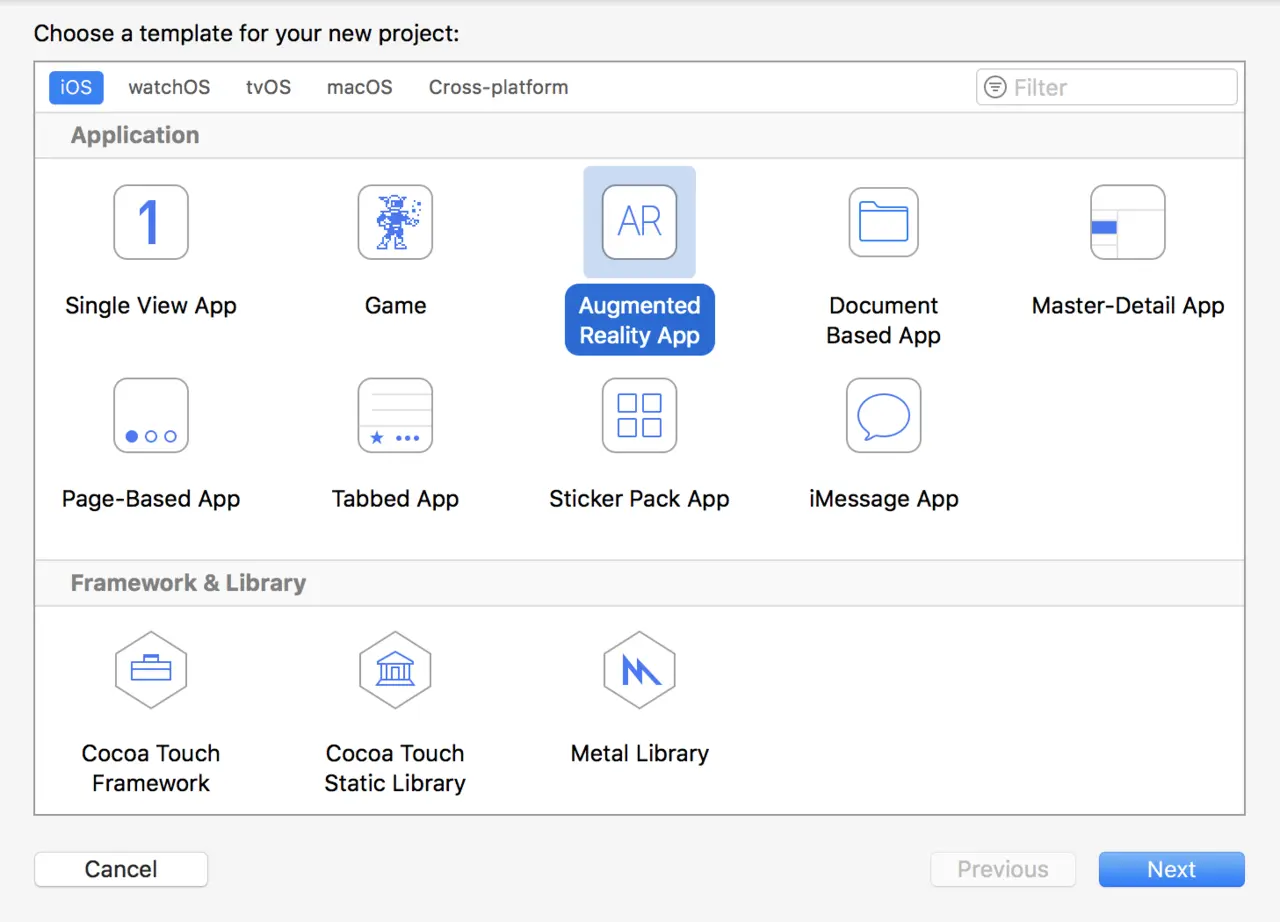 Xcode已经集成了AR项目的创建入口,直接可以创建一个自带小飞机的AR工程.