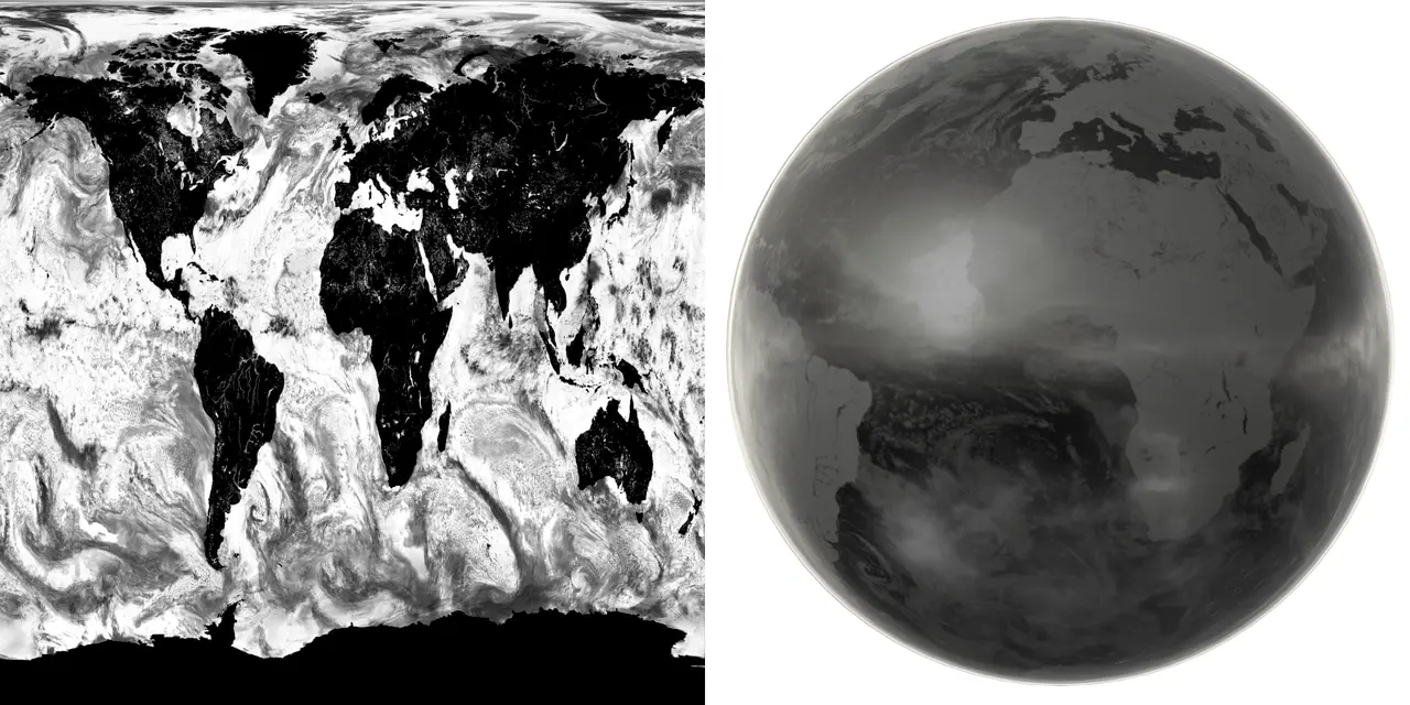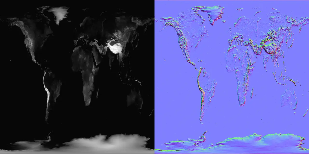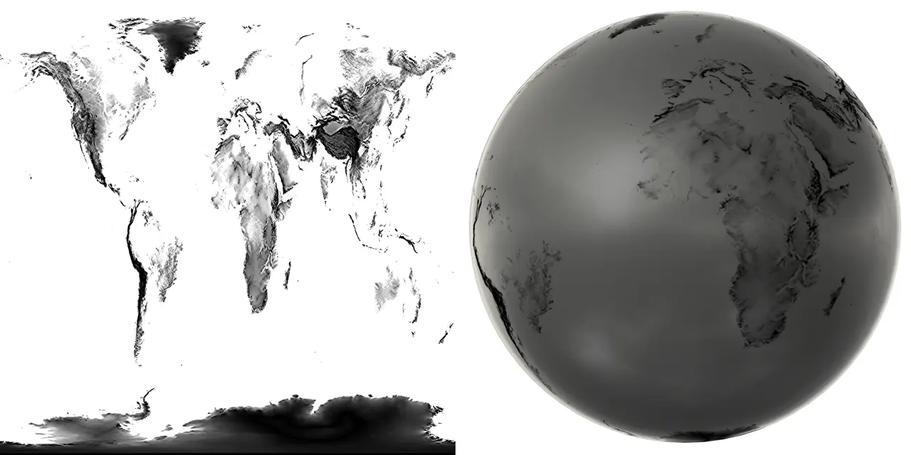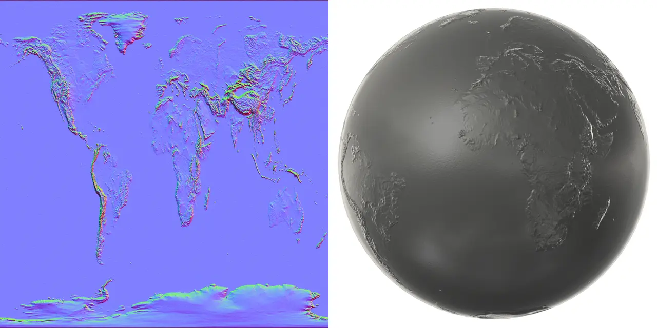 在位移贴图中,我们可以真正地改变表面地形.灰色到白色表示凸起,灰色到黑色表示凹陷: