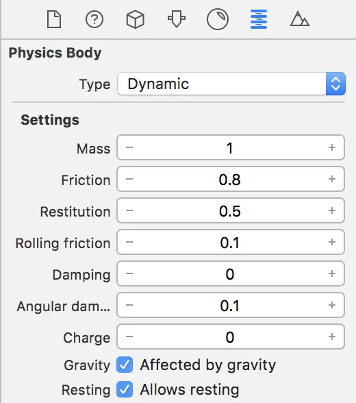 力使用3维向量SCNVector3表示,使用applyForce(_: atPosition: impluse:)方法来添加一个力,并指定位置.一个力可以同时影响线速度和角速度. impluse脉冲状只作用一次,比如踢一个球,非脉冲状的则可以持续作用. Position位置可以影响力的作用效果