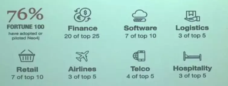 上图是世界百强公司中使用图数据库的比例,作为引领着这个世界潮流的存在,他们用图数据库肯定也是基于对长远的发展或者前瞻性的考虑。可以看到其中软件开发和金融行业的公司是应用比例相对较高的,像微软和Oracle等公司很早就开始支持图数据库了。还有一些是物流公司,因为图数据能够帮助实现物流的快速到达。