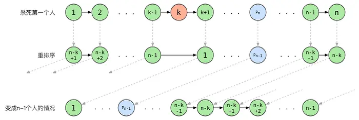 易知,初始位置为 k 的人会被第一个杀掉。此时,经过重新排序之后,问题变成了 n-1 个人的情形。幸存者的位置为 。如果能够找到从