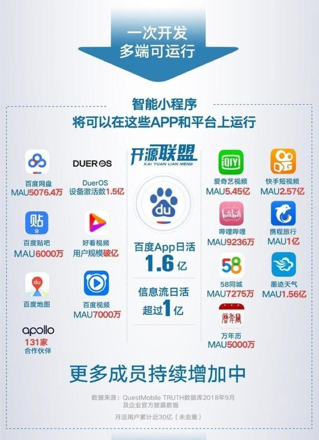 而通过开源联盟体系可以将开发者的智能小程序分发到更多移动平台上,百度已打通贴吧、百度视频、爱奇艺、58同城等诸多平台,随着开源联盟加入者的逐步累积,智能小程序的生存空间也将快速扩张甚至囊括整个移动互联网。