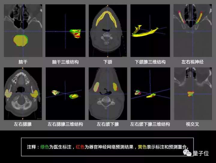 如上图所示,其中绿色为医生标注,红色为器官神经网络预测结果,黄色表示标注和预测重合,结果显示高度一致。