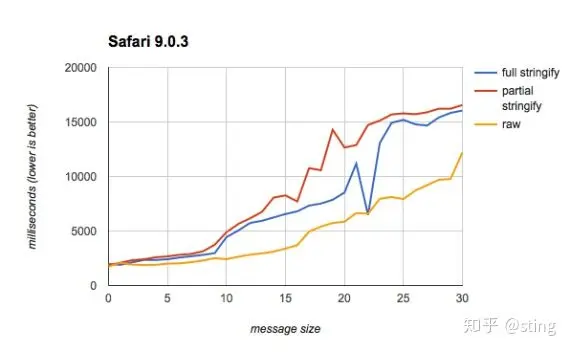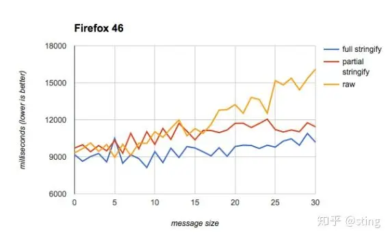 Worker 与“主线程”之间的数据传递默认是通过结构化克隆(Structured Clone)。但数据量较大时,克隆过程会比较耗时,会影响 postMessage 和 onmessage 函数的执行时间。可以先通过 JSON.stringify 将对象序列化,接收之后再用 JSON.parse 还原。国外大神测试使用JSON.stringify 和 JSON.parse 的性能对比。 测试版本有点低,不过能说明使用stringify的性能更好一些。