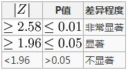 计算出的Z的绝对值和P值的关系如下: