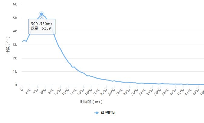 由于我们主要关注用户的首屏时间,因此我这里拿到了一周内首屏数据的抽样结果(约13万条),为了了解首屏时间的分布情况,我以50ms为间距统计各个时间段内的数据量,绘制折线图结果如下: