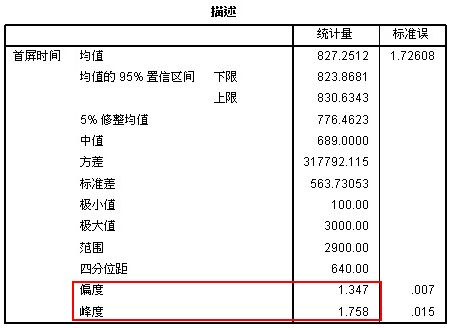 - 偏度:描述数据的对称性,也就是偏离正态分布中心的程度。正态分布的偏度为0,偏度越接近0,说明数据正态性越好;同样,通常偏度大于偏度标准误差的1.96倍,即可认为数据不符合正态分布。