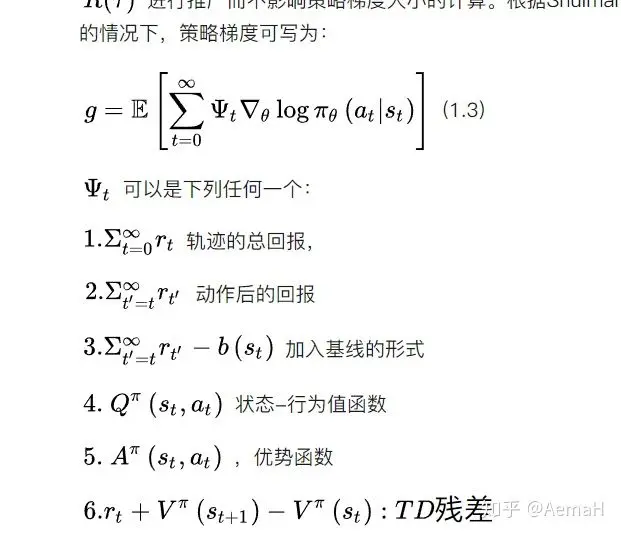 > 4—6: 利用动作值函数,优势函数和TD偏差代替累积回报,其优点是方差小,但是这三种方法中都用到了逼近方法,因此计算出来的策略梯度都存在偏差。这三种方法以牺牲偏差来换取小的方差。当Ψ_t取4—6时,为经典的AC方法。